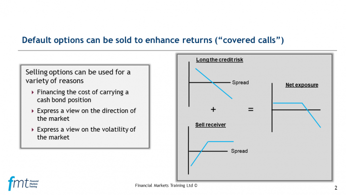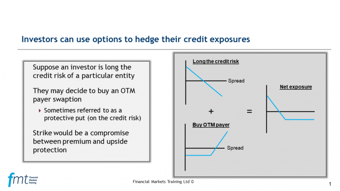 We illustrate the net exposure on the right hand panel. If the credit risk improves (i.e. the spread falls) the option lapses and the investor benefits. If the underlying credit risk declines (i.e. the spread increases), the investor exercises the option to mitigate the losses.
